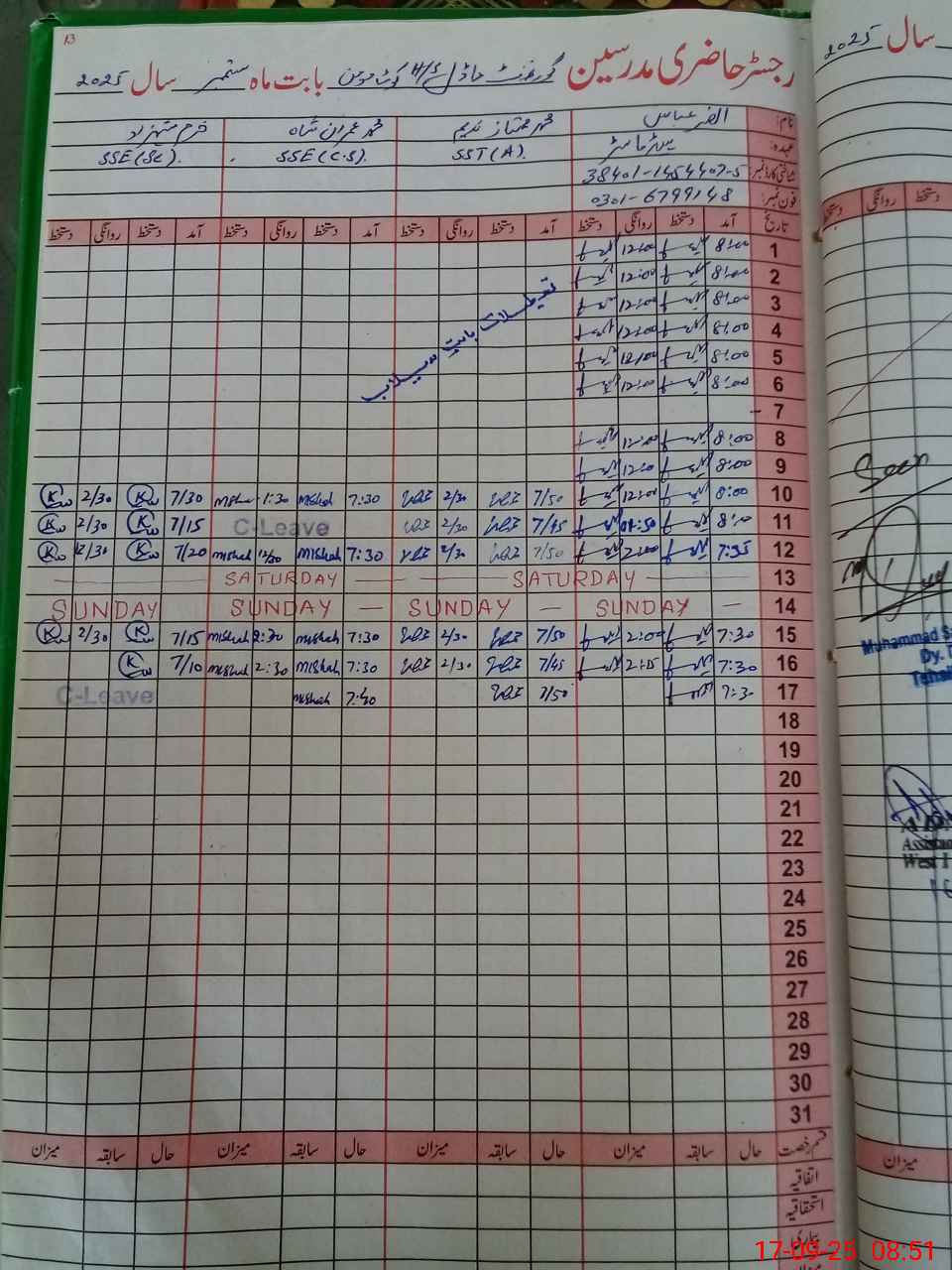 | CNIC | Full Name | Designation | R/C | Absence During Last Calender Month |