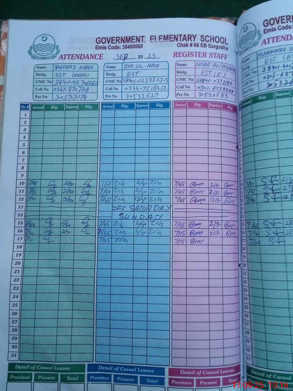 | CNIC | Full Name | Designation | R/C | Absence During Last Calender Month |