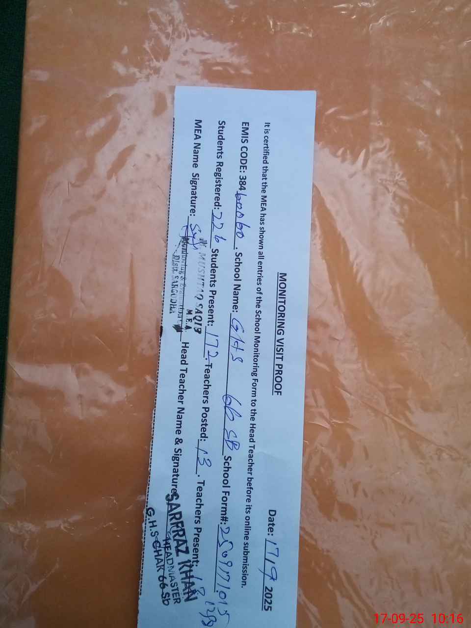 | Attendance Register | Head Teacher | MEA with School | Visit Proof |