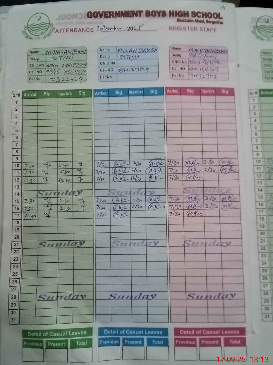 | CNIC | Full Name | Designation | R/C | Absence during last cal. month |
