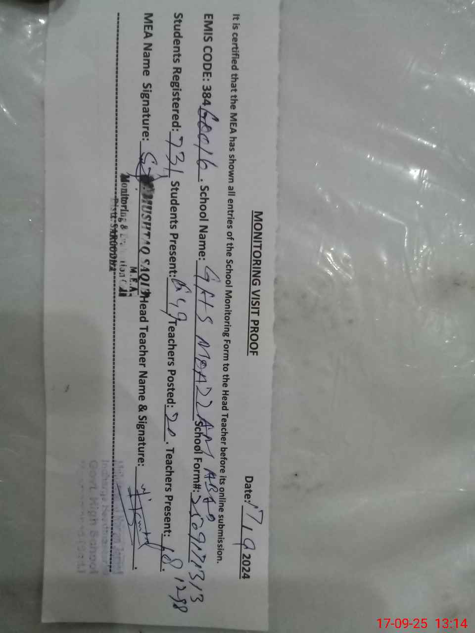 | Attendance Register | Head Teacher | MEA with School | Visit Proof |