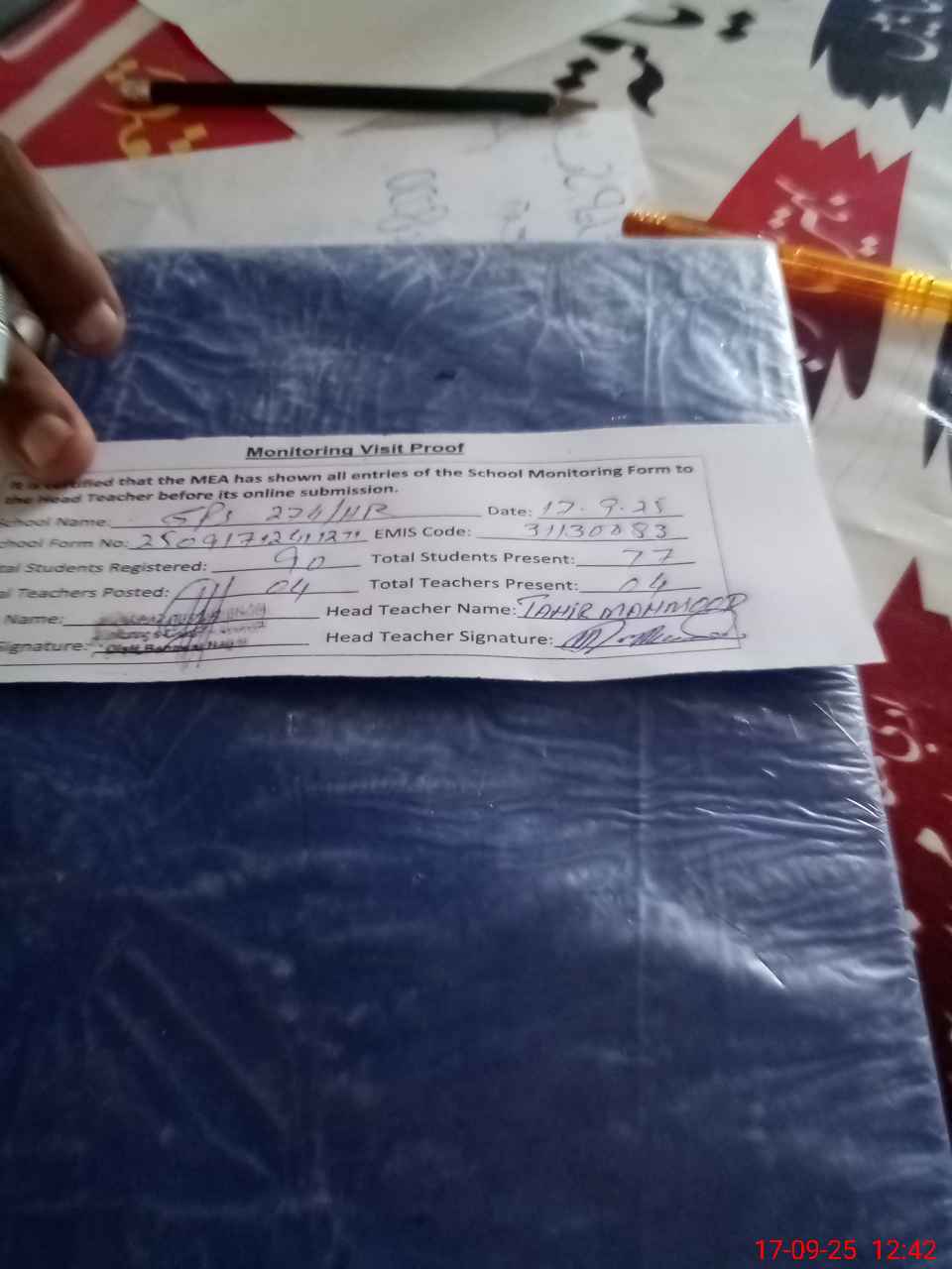 | Attendance Register | Head Teacher | MEA with School | Visit Proof |