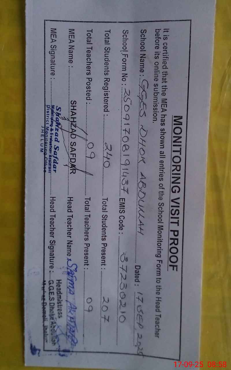 | EMIS Code: 37230210 | Name of School: GGES DHOK ABDULLAH | |||