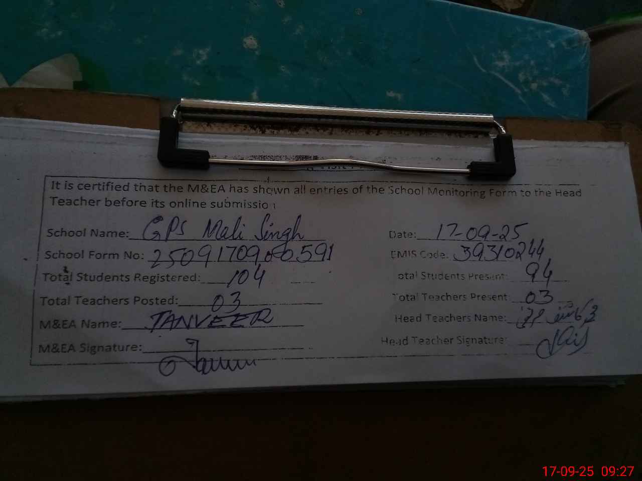 | EMIS Code: 39310244 | Name of School: GPS MALI SINGH | |||