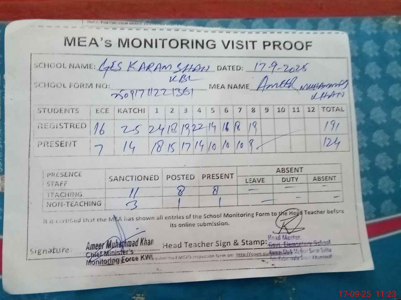 | Attendance Register | Head Teacher | MEA with School | Visit Proof |