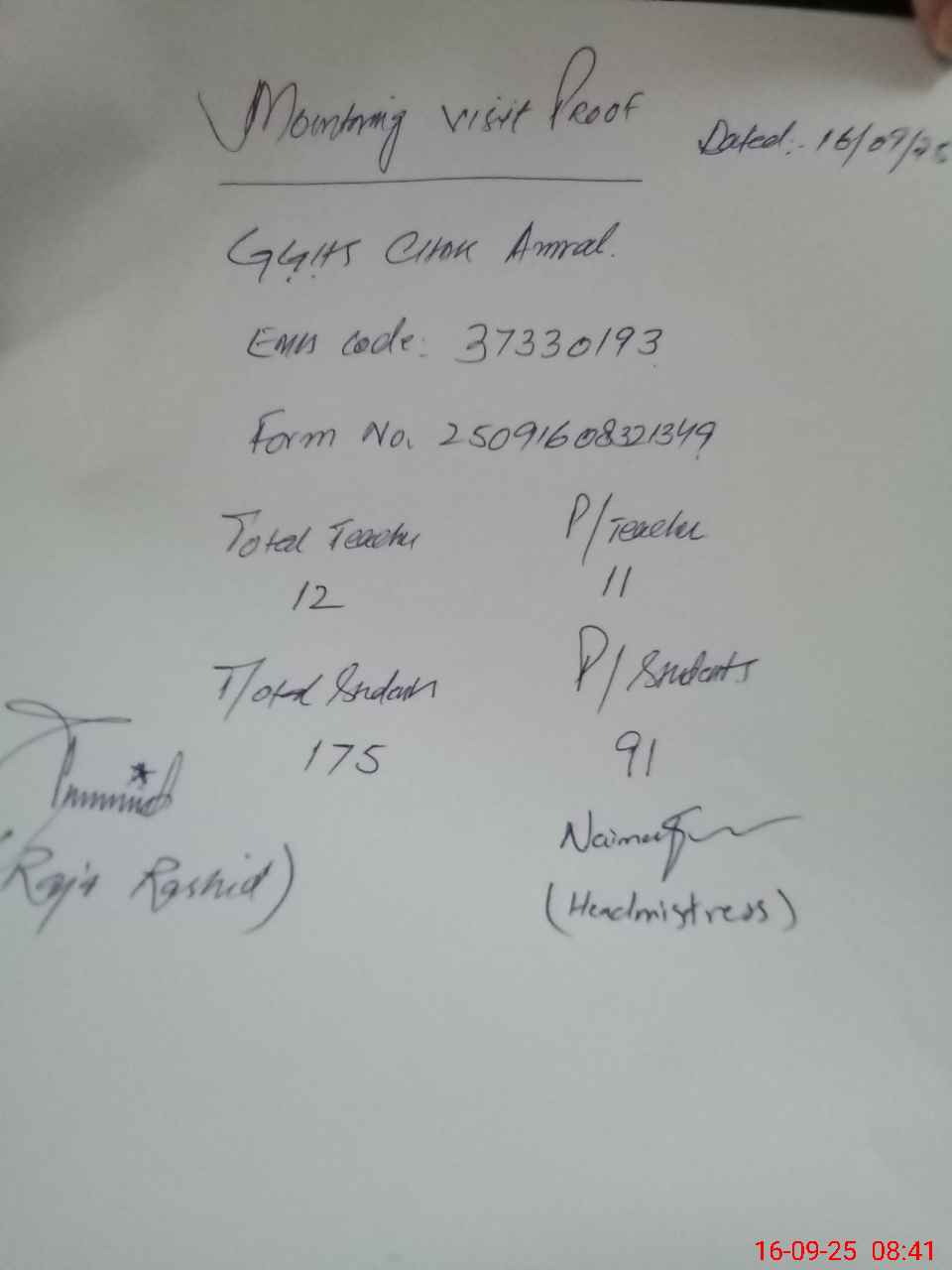 | Attendance Register | Head Teacher | MEA with School | Visit Proof |