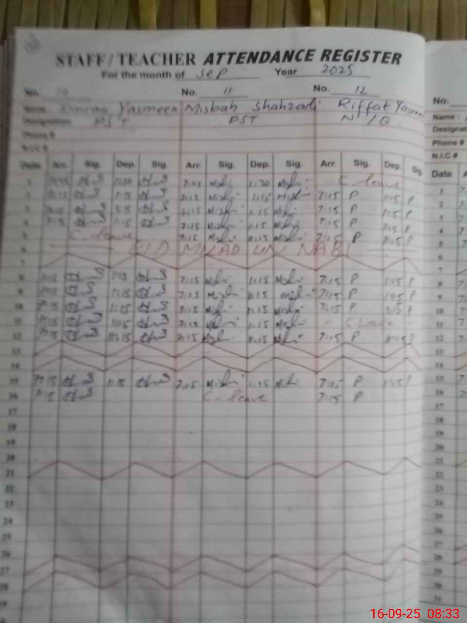 | CNIC | Full Name | Designation | R/C | Absence During Last Calender Month |