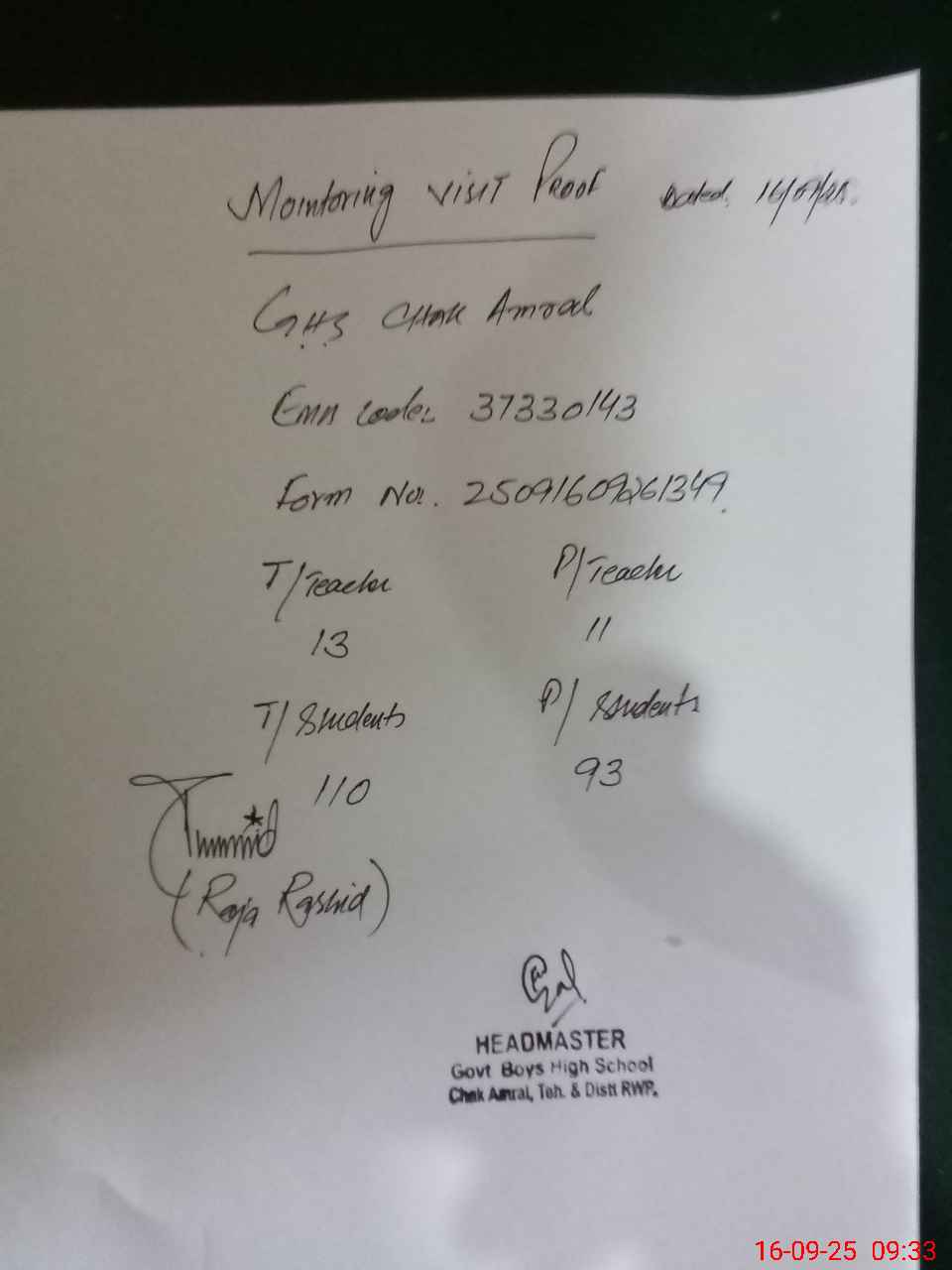 | Name: Fa**** UrRe**** Designation: (School Headmaster's/Headmistress's) I/C HM Phone/Cell Number: 03**** |