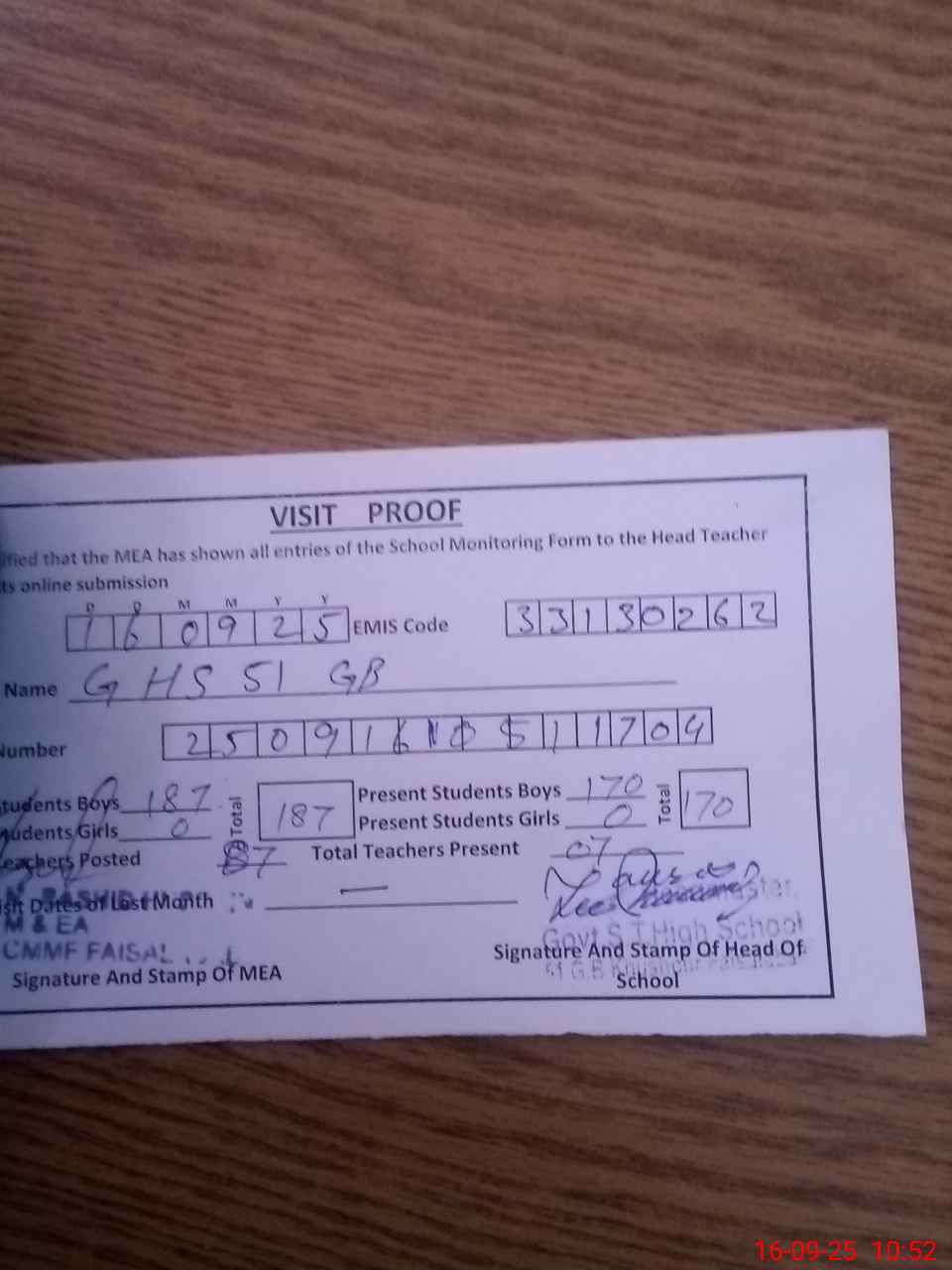 | Certified that this School was Inspected by the Undersigned MEA/DMO Today and the Information Stated Above is as Per Record. | |||||