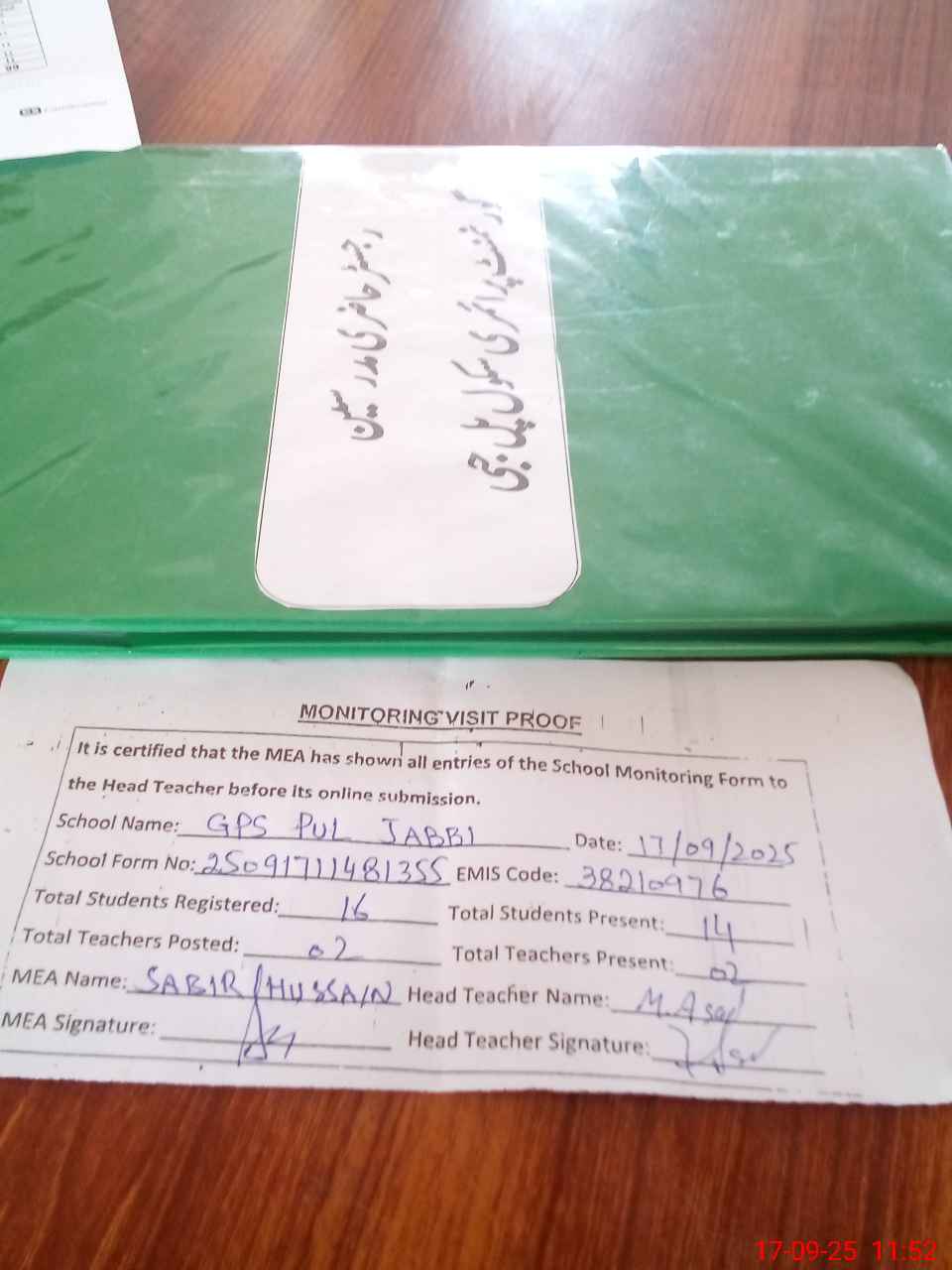 | Attendance Register | Head Teacher | MEA with School | Visit Proof |