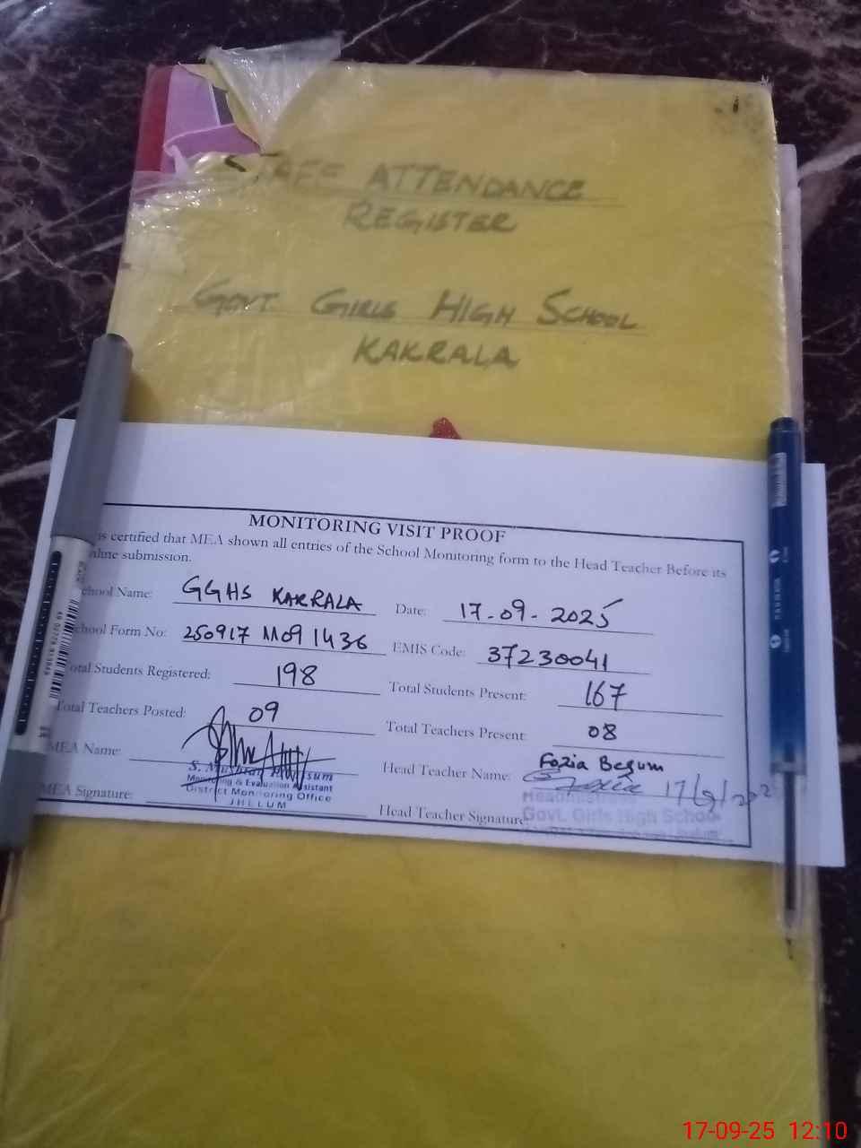 | Attendance Register | Head Teacher | MEA with School | Visit Proof |