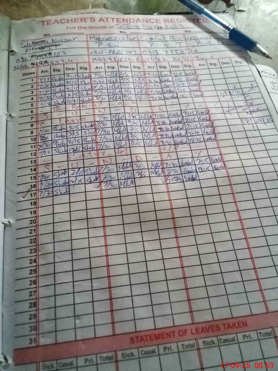 | CNIC | Full Name | Designation | R/C | Absence During Last Calender Month |