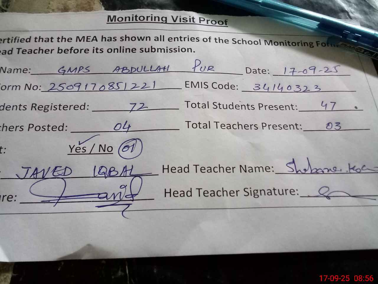 | Attendance Register | Head Teacher | MEA with School | Visit Proof |