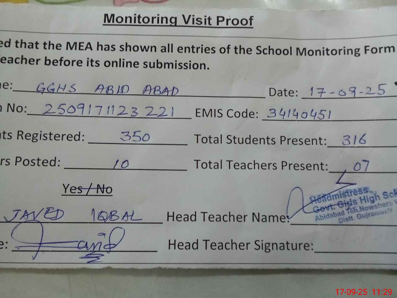 | Attendance Register | Head Teacher | MEA with School | Visit Proof |