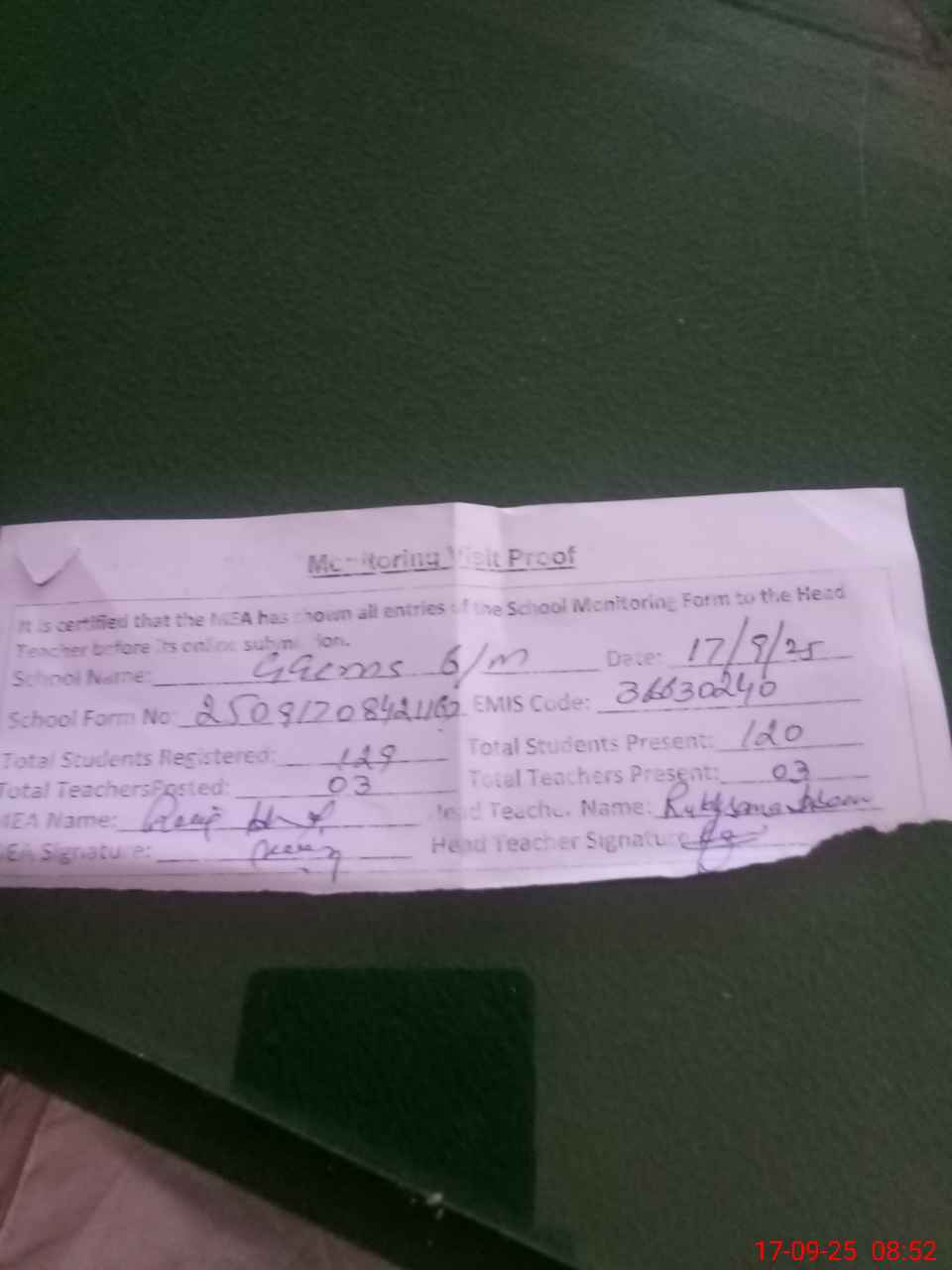 | Attendance Register | Head Teacher | MEA with School | Visit Proof |