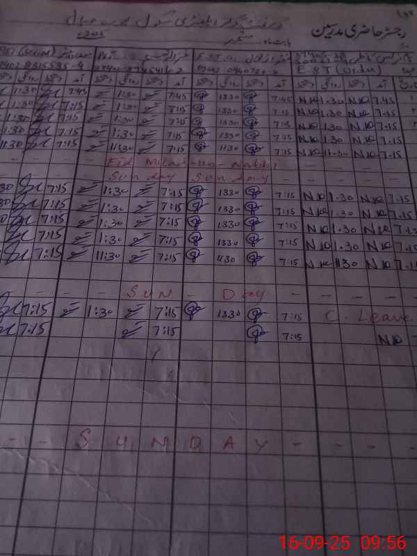 | CNIC | Full Name | Designation | R/C | Absence During Last Calender Month |