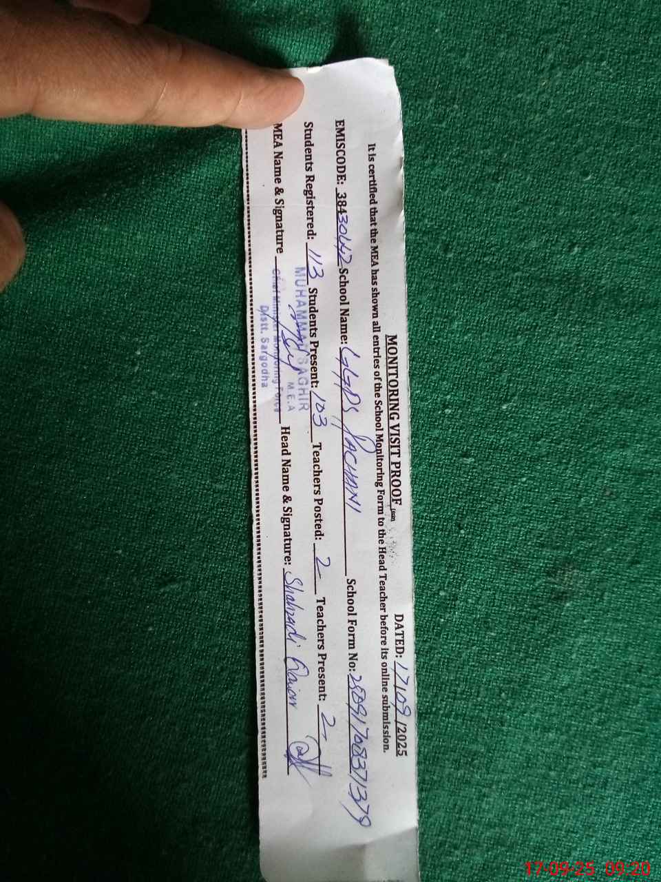 | Attendance Register | Head Teacher | MEA with School | Visit Proof |