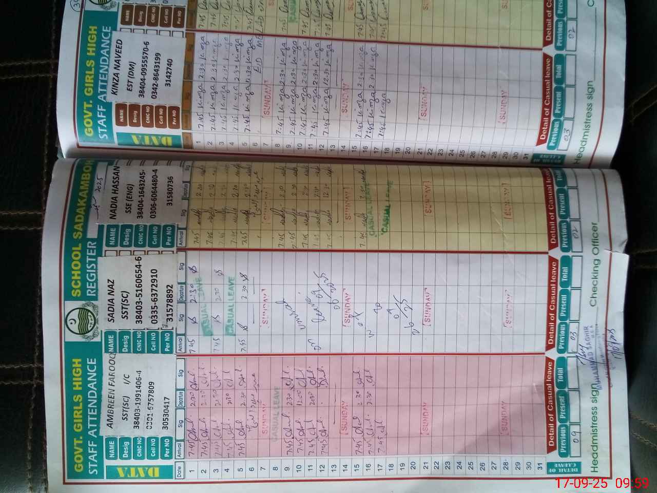 | CNIC | Full Name | Designation | R/C | Absence during last cal. month |