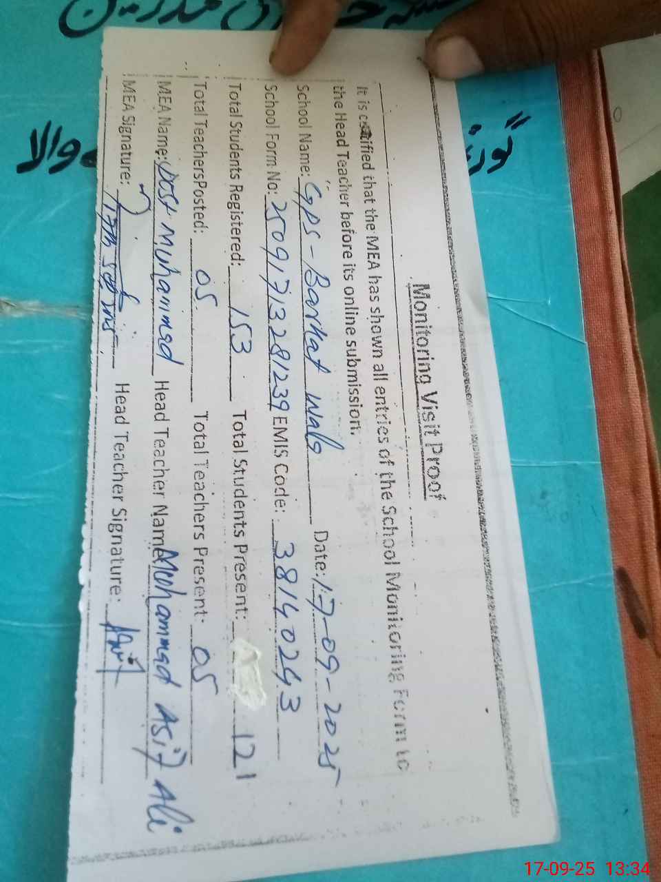 | Attendance Register | Head Teacher | MEA with School | Visit Proof |