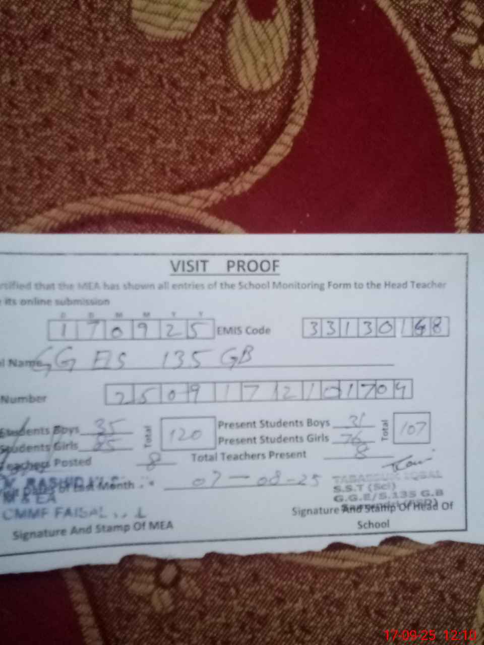 | Attendance Register | Head Teacher | MEA with School | Visit Proof |