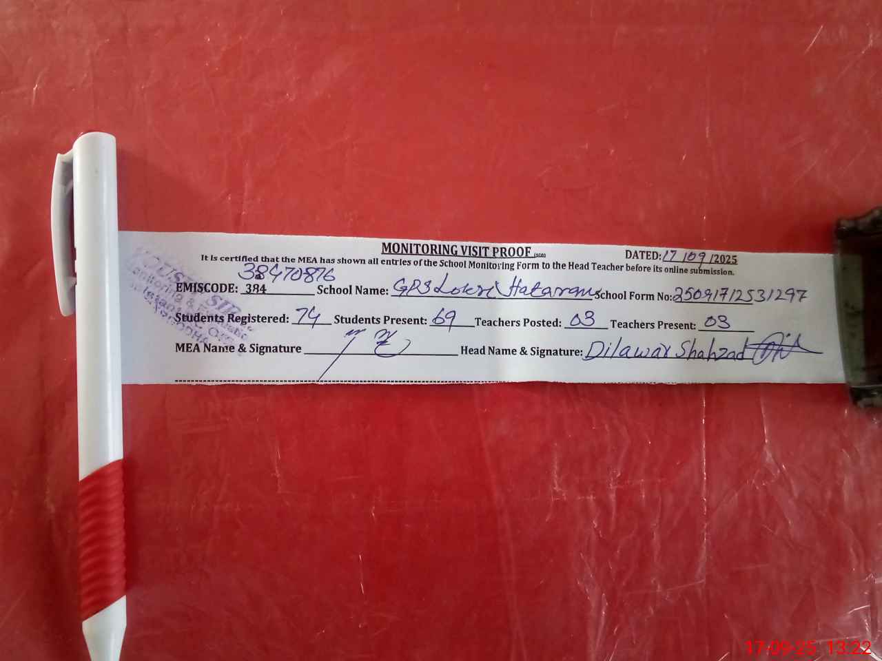 | Attendance Register | Head Teacher | MEA with School | Visit Proof |
