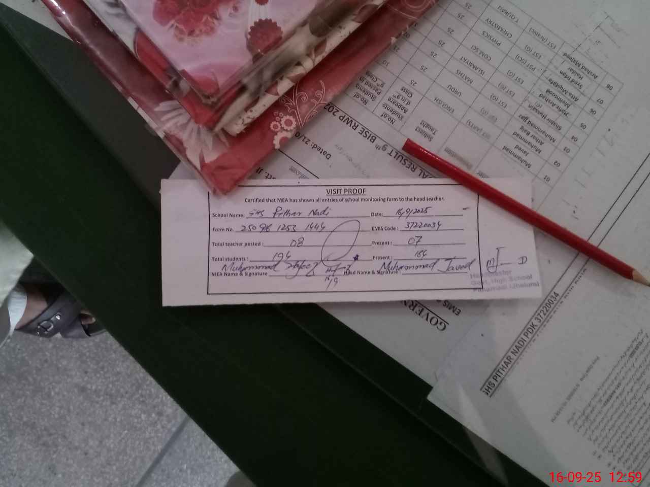 | Attendance Register | Head Teacher | MEA with School | Visit Proof |