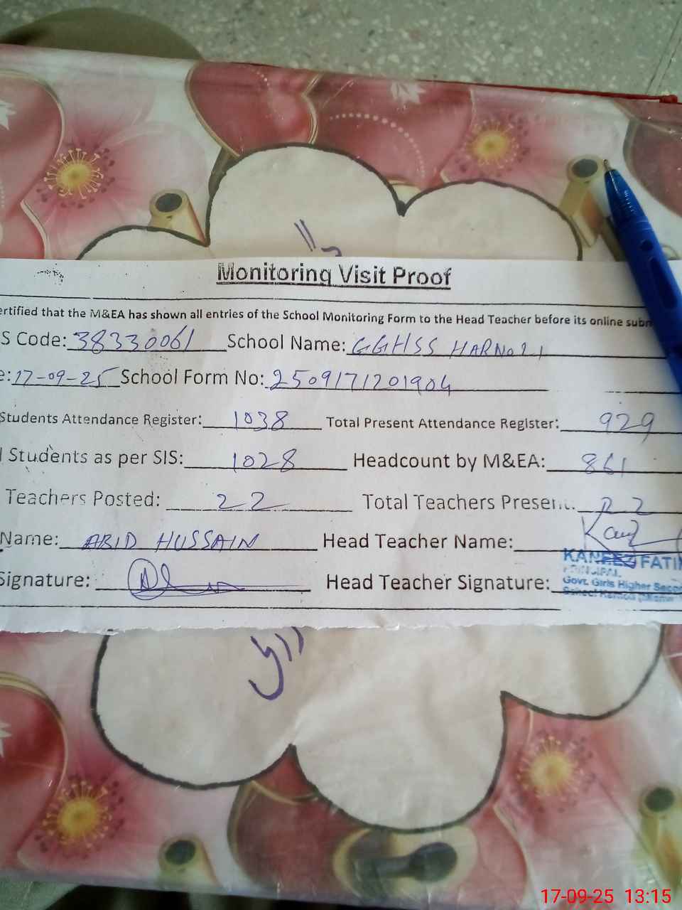 | Attendance Register | Head Teacher | MEA with School | Visit Proof |