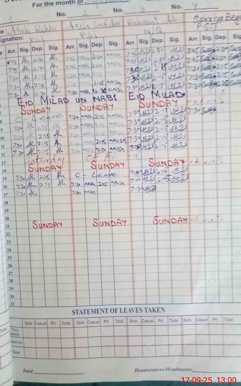 | CNIC | Full Name | Designation | R/C | Absence During Last Calender Month |