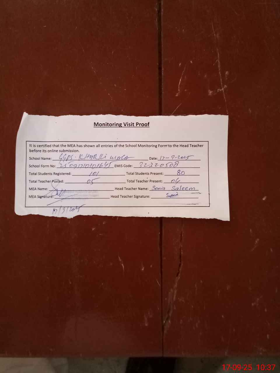| Attendance Register | Head Teacher | MEA with School | Visit Proof |