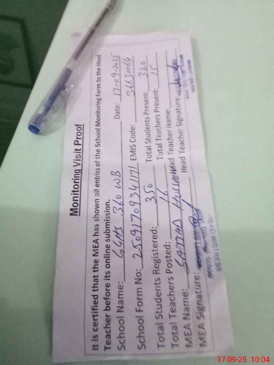 | Attendance Register | Head Teacher | MEA with School | Visit Proof |