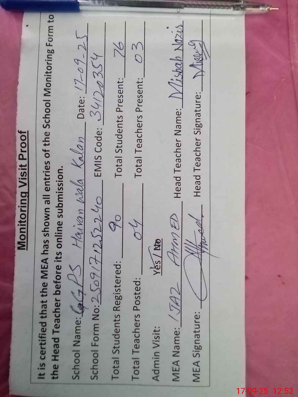 | Attendance Register | Head Teacher | MEA with School | Visit Proof |