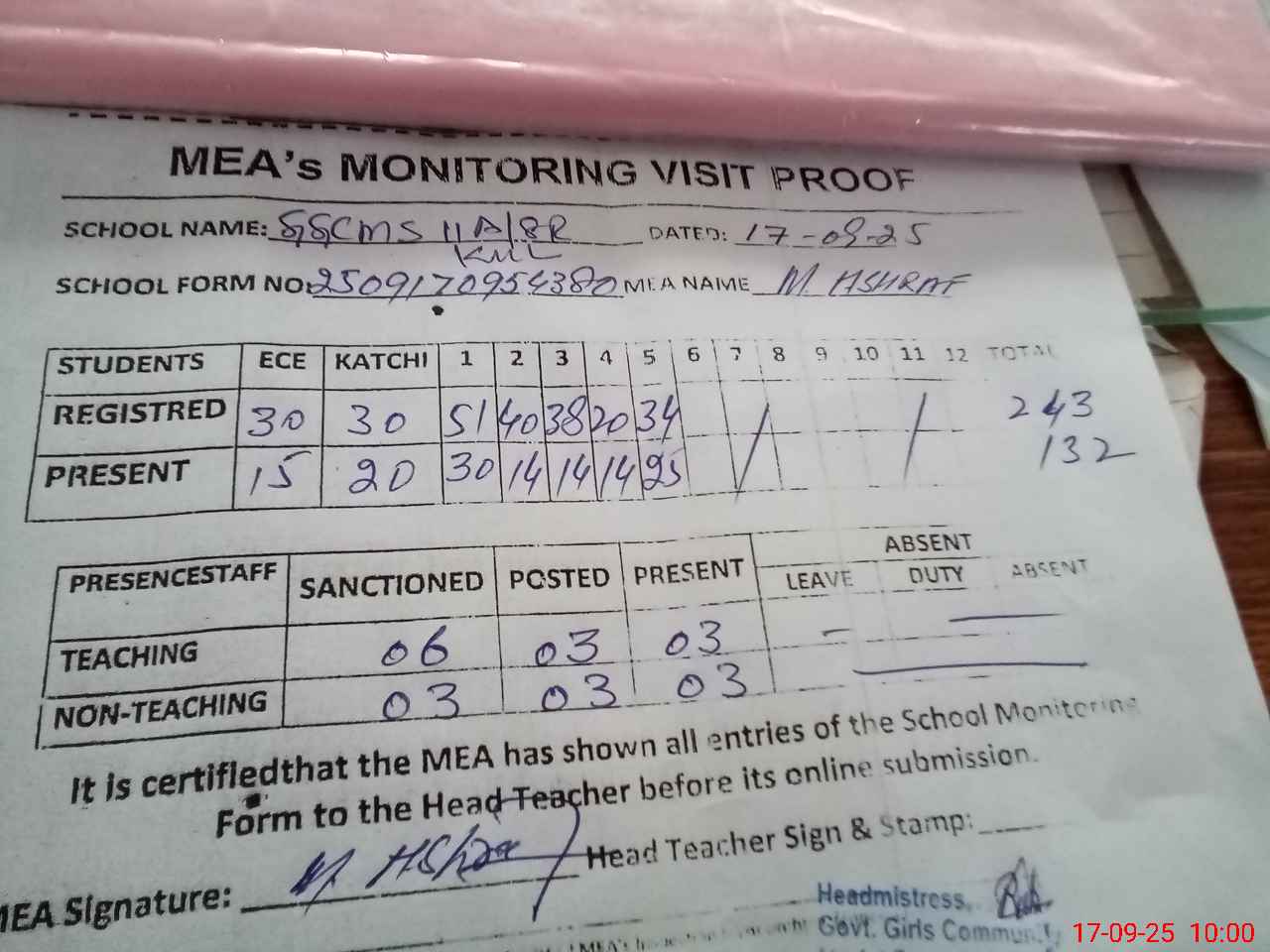| Attendance Register | Head Teacher | MEA with School | Visit Proof |