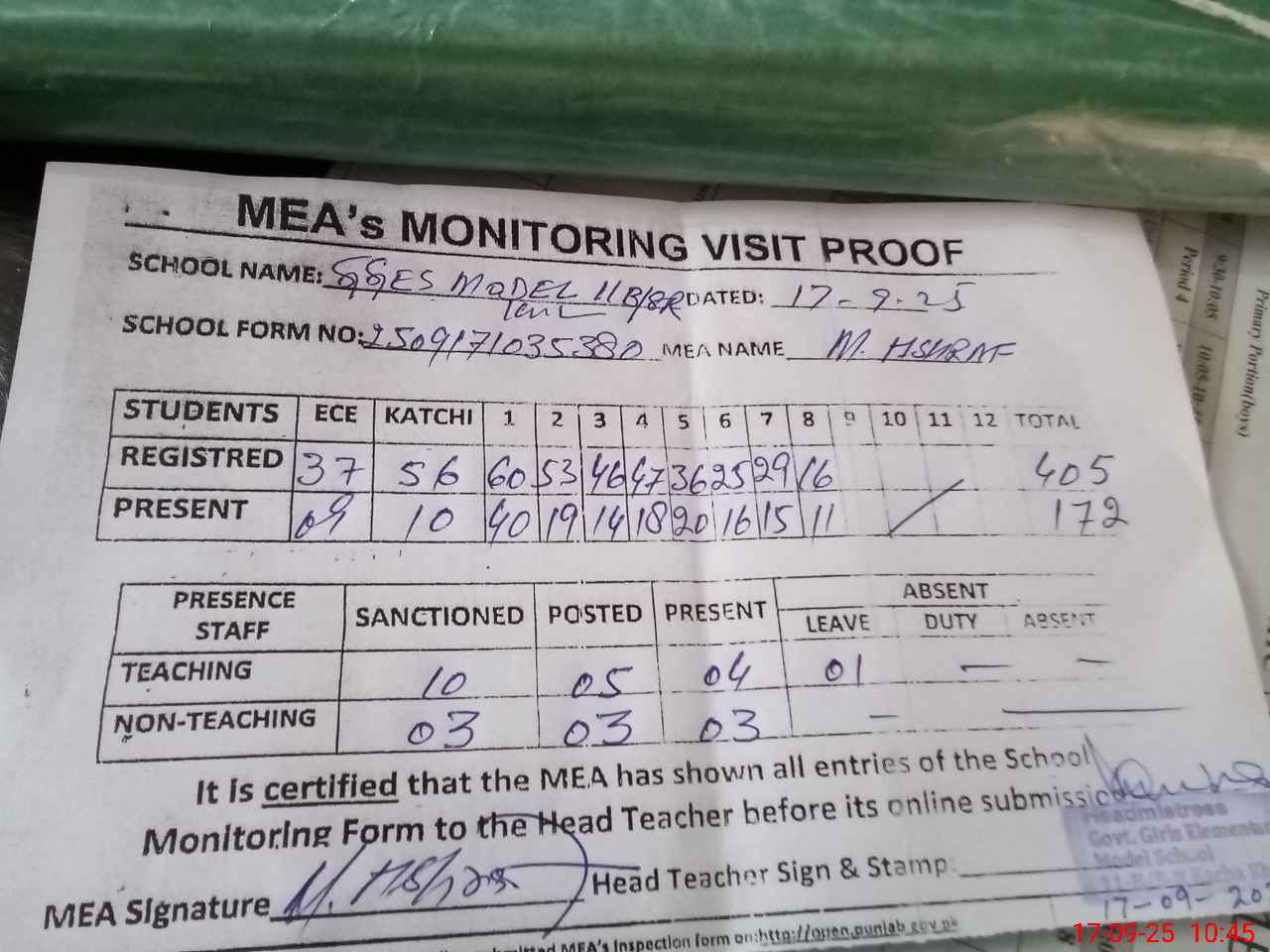 | Attendance Register | Head Teacher | MEA with School | Visit Proof |