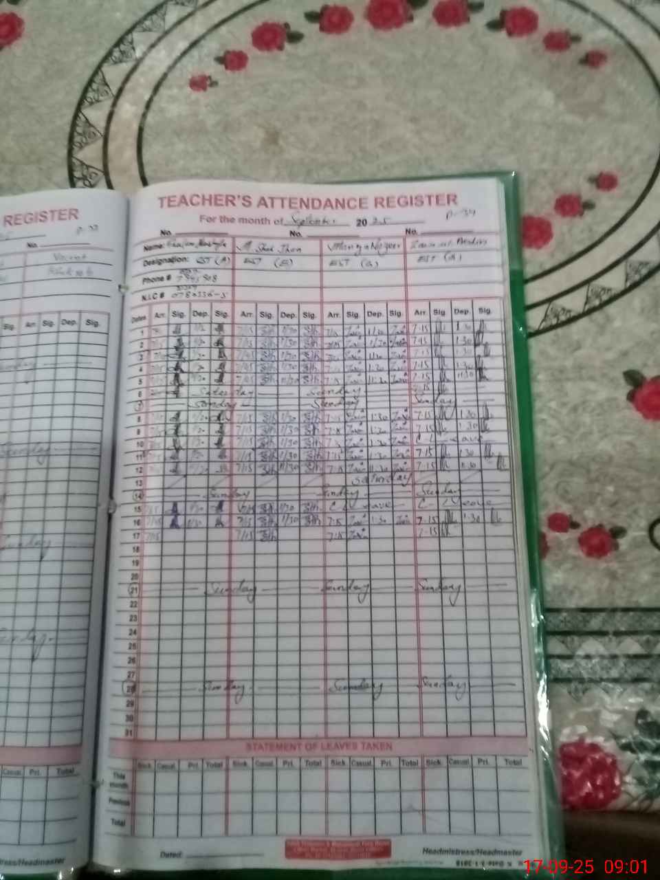 | CNIC | Full Name | Designation | R/C | Absence During Last Calender Month |