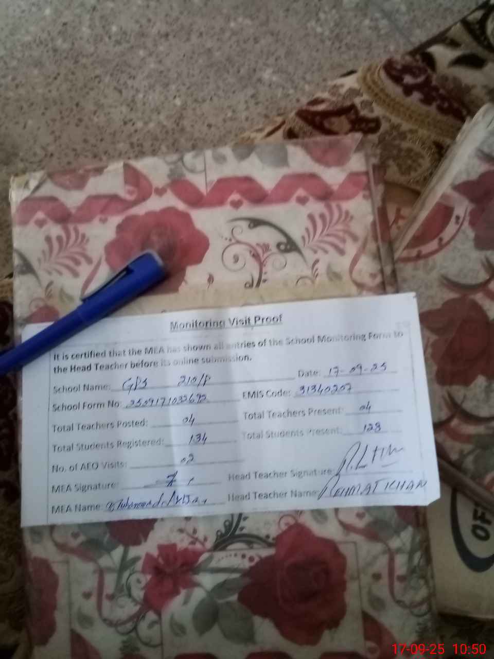 | Attendance Register | Head Teacher | MEA with School | Visit Proof |
