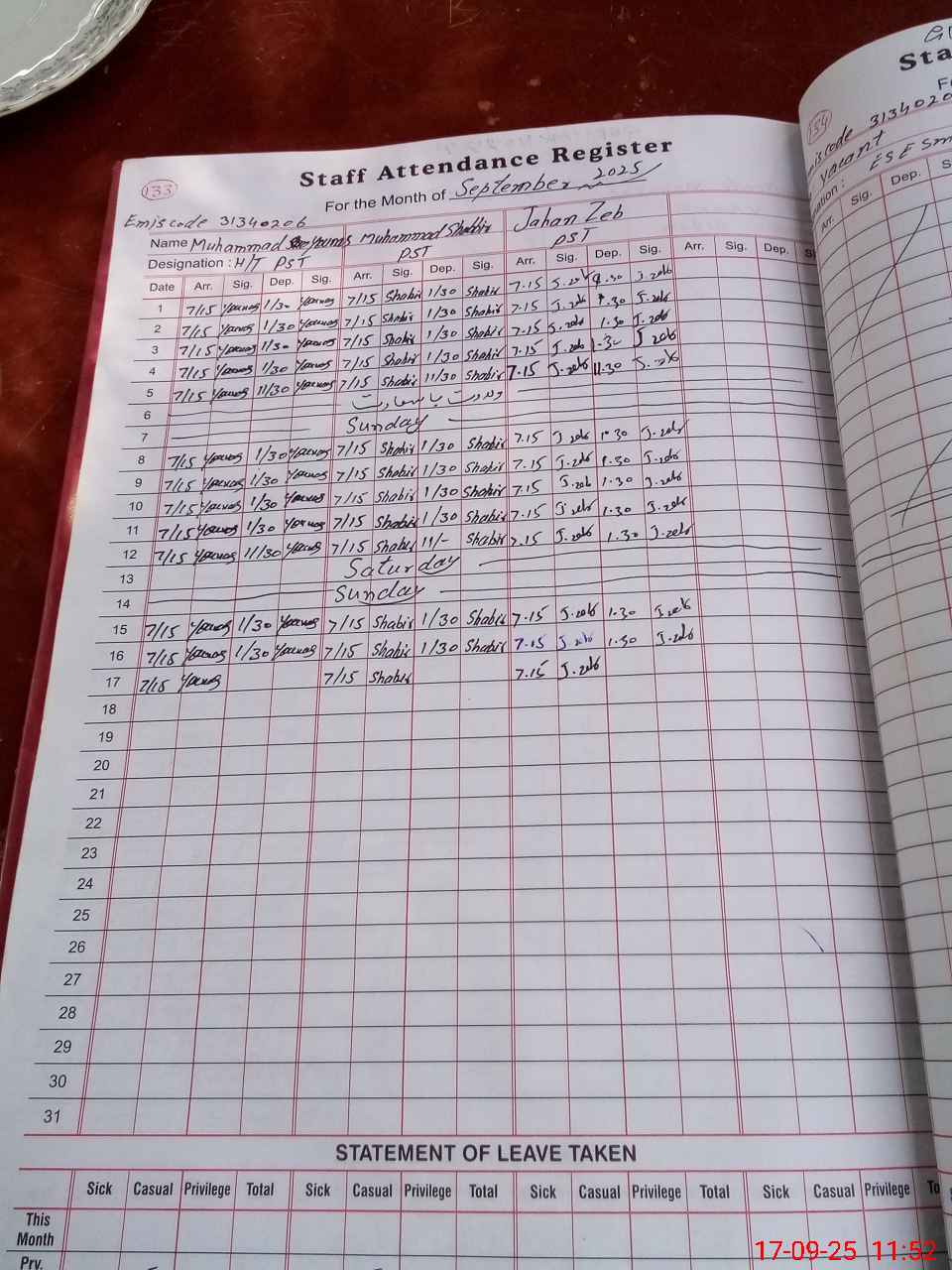 | CNIC | Full Name | Designation | R/C | Absence during last cal. month |