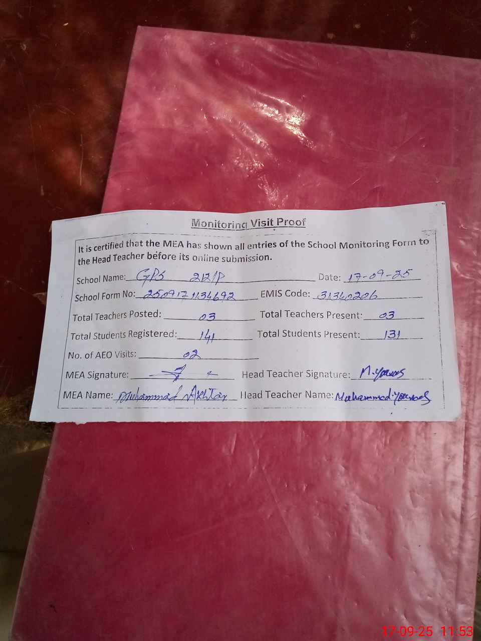 | Attendance Register | Head Teacher | MEA with School | Visit Proof |