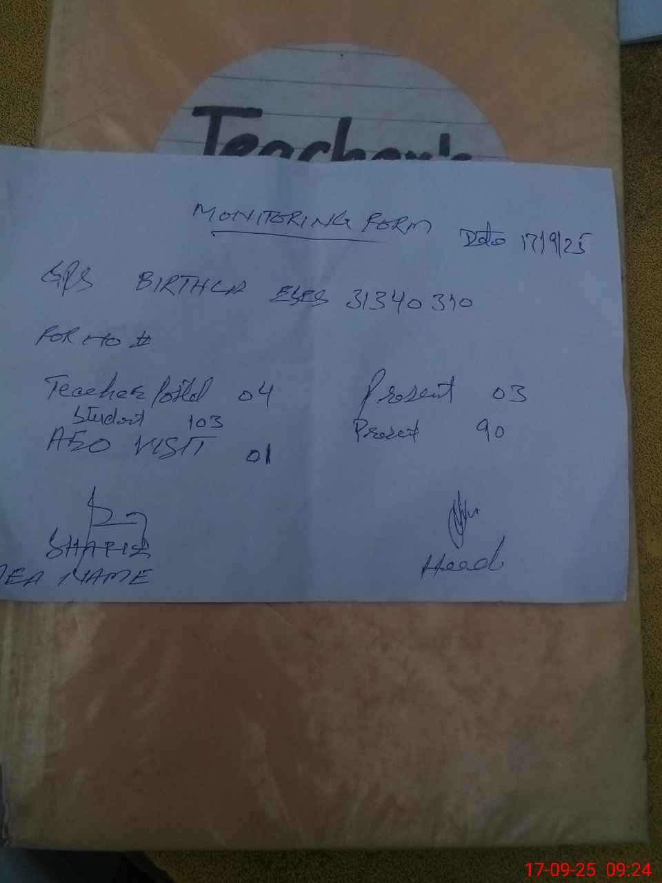 | Attendance Register | Head Teacher | MEA with School | Visit Proof |