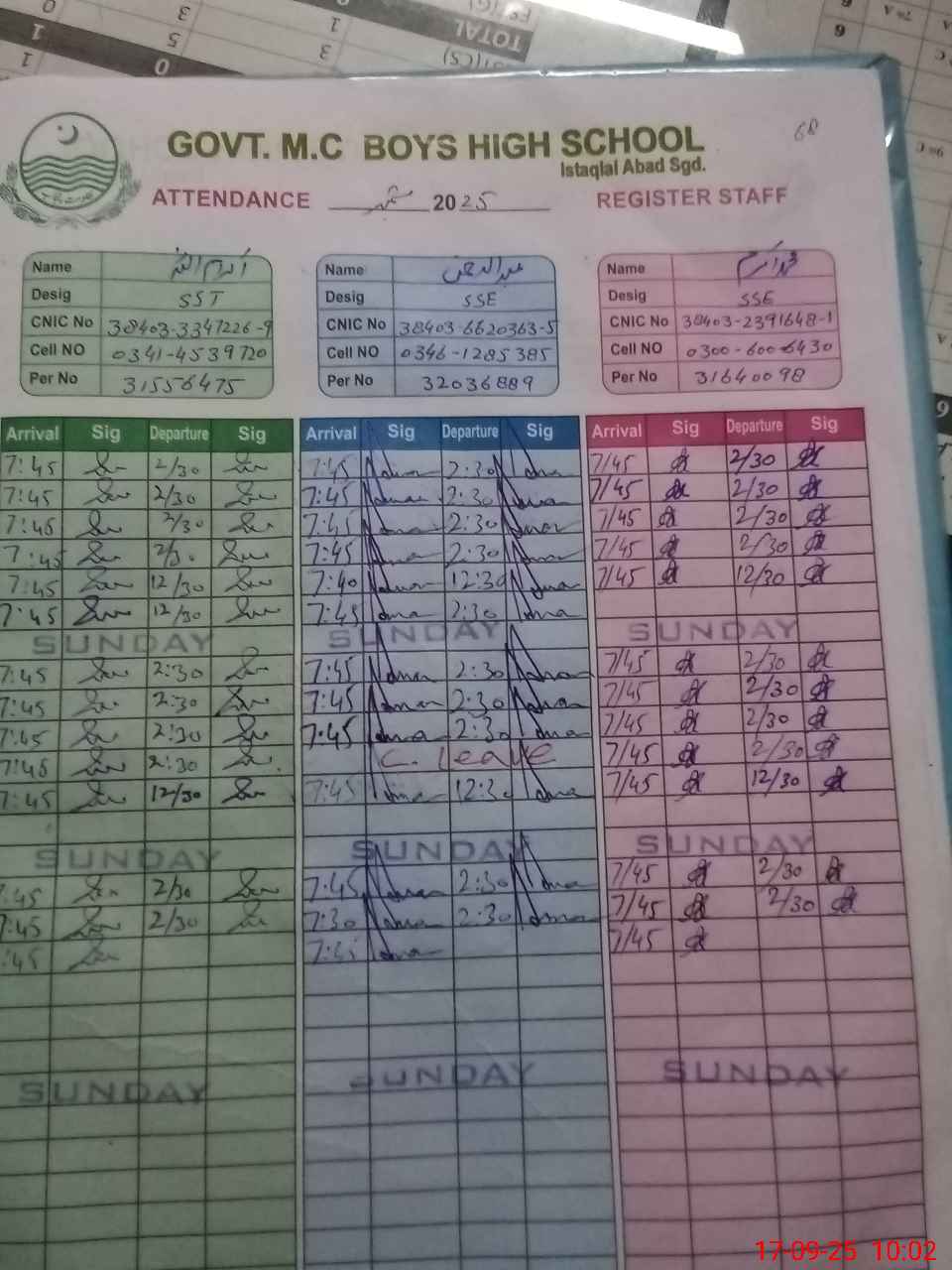 | CNIC | Full Name | Designation | R/C | Absence during last cal. month |