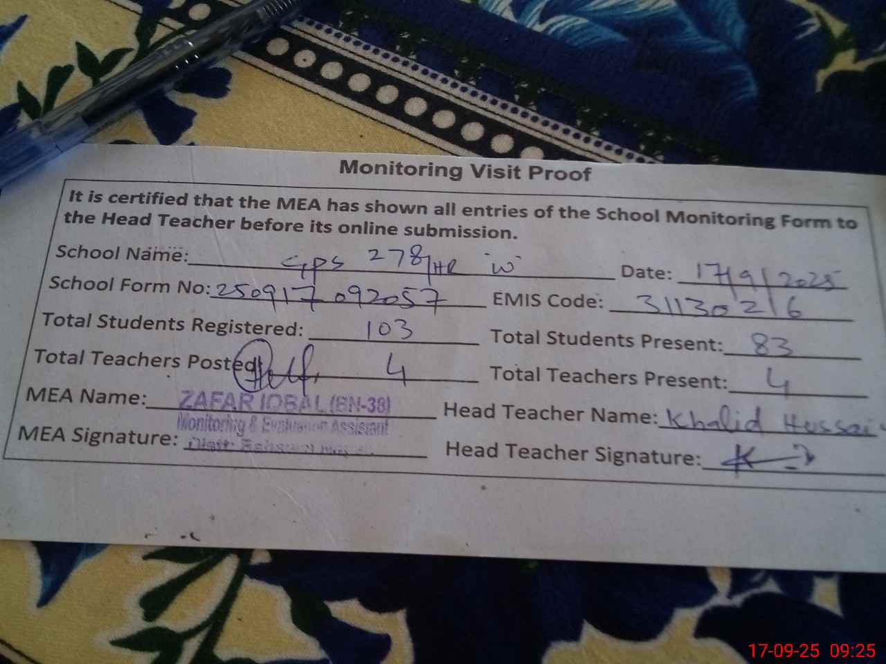 | Monitoring Date: 17-09-2025 | Start Time: 17-09-2025 09:09 AM | End Time: 17-09-2025 09:25 AM | Name of MEA: Za**** Iq**** BN**** | |