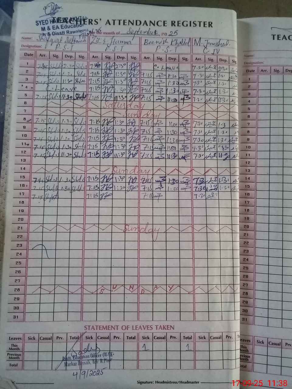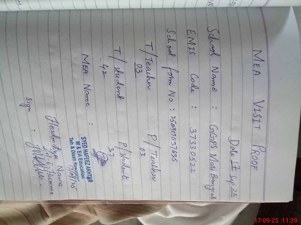 | Monitoring Date: 17-09-2025 | Start Time: 17-09-2025 11:21 AM | End Time: 17-09-2025 11:46 AM | Name of MEA: Sy**** Ha**** Ak**** | |