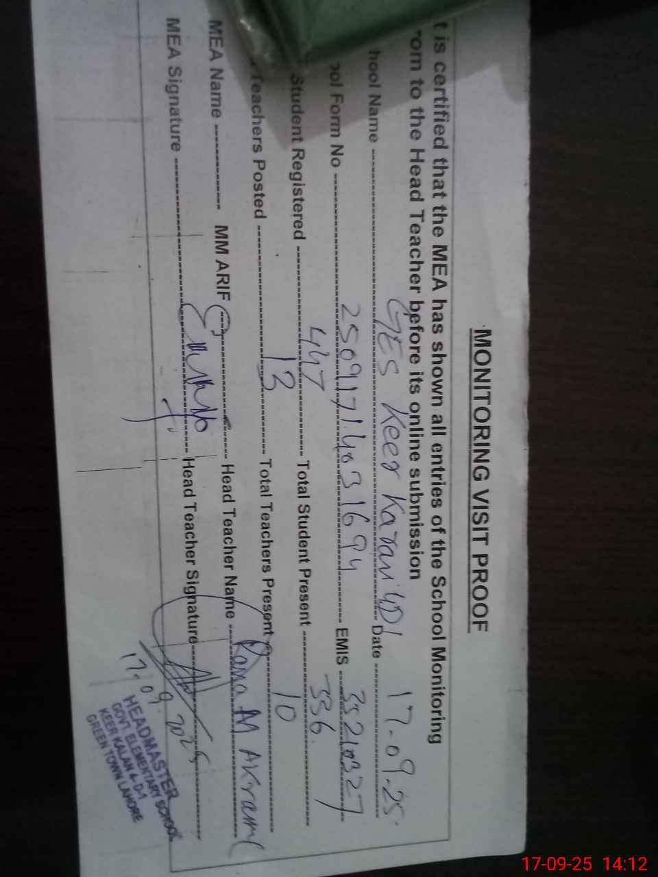 | Attendance Register | Head Teacher | MEA with School | Visit Proof |