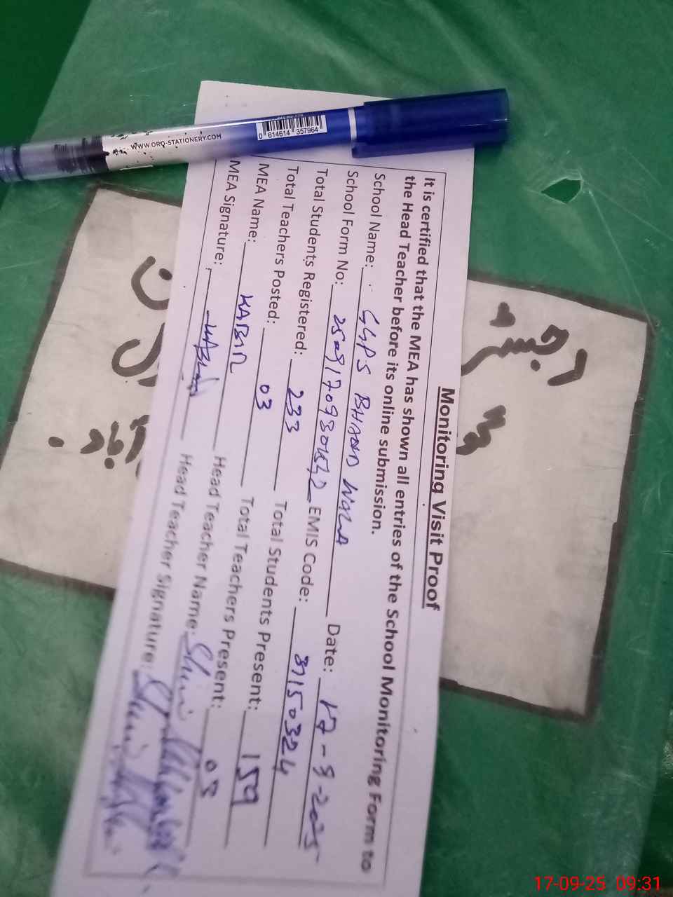 | Attendance Register | Head Teacher | MEA with School | Visit Proof |