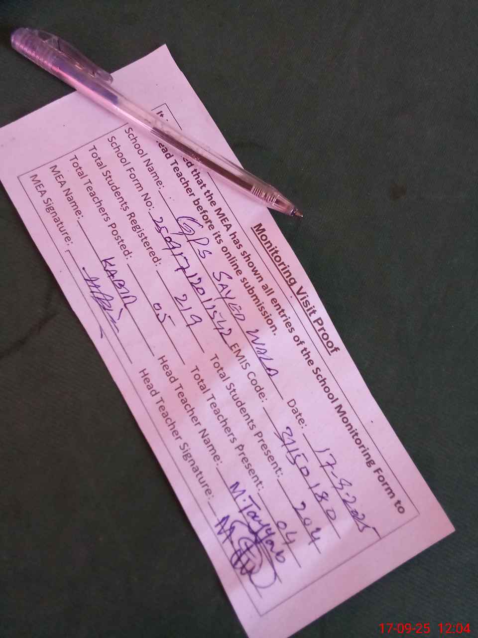 | Attendance Register | Head Teacher | MEA with School | Visit Proof |