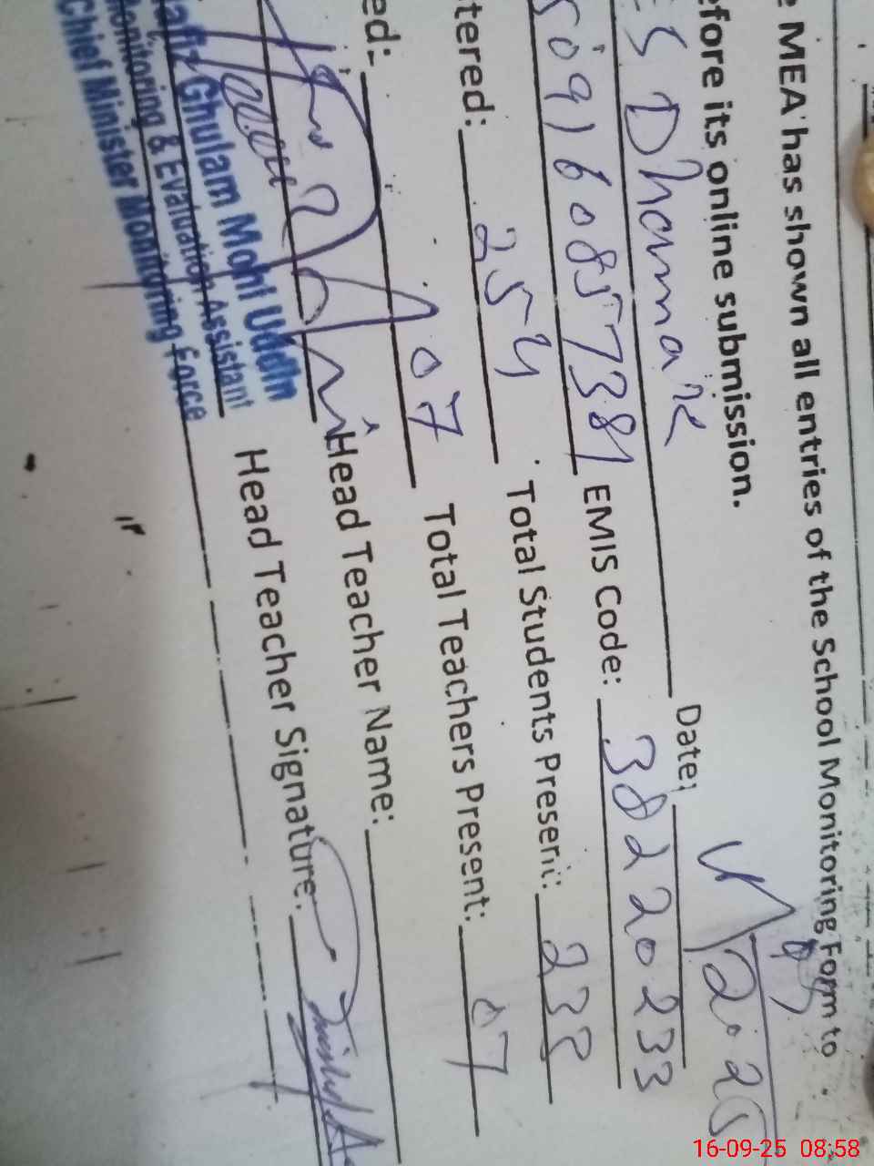 | Name: Mu**** Ha**** Designation: (School Headmaster's/Headmistress's) SST Phone/Cell Number: 03**** |