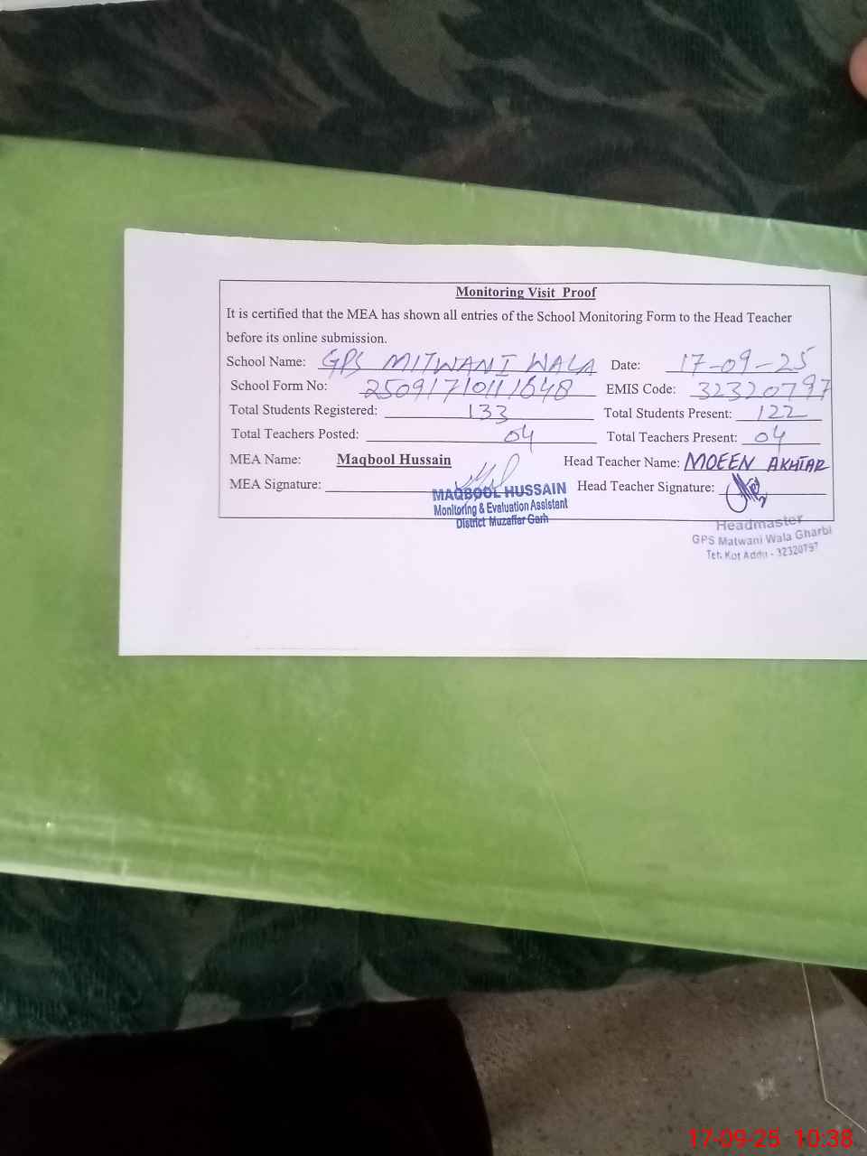 | Name: M.**** Designation: (School Headmaster's/Headmistress's) PST Phone/Cell Number: 03**** |