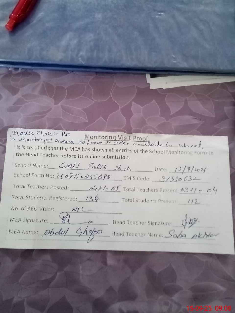 | Attendance Register | Head Teacher | MEA with School | Visit Proof |