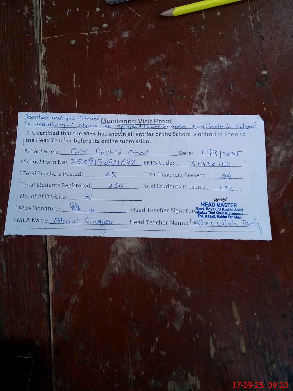 | EMIS Code: 31330162 | Name of School: GES RASHID ABAD | |||