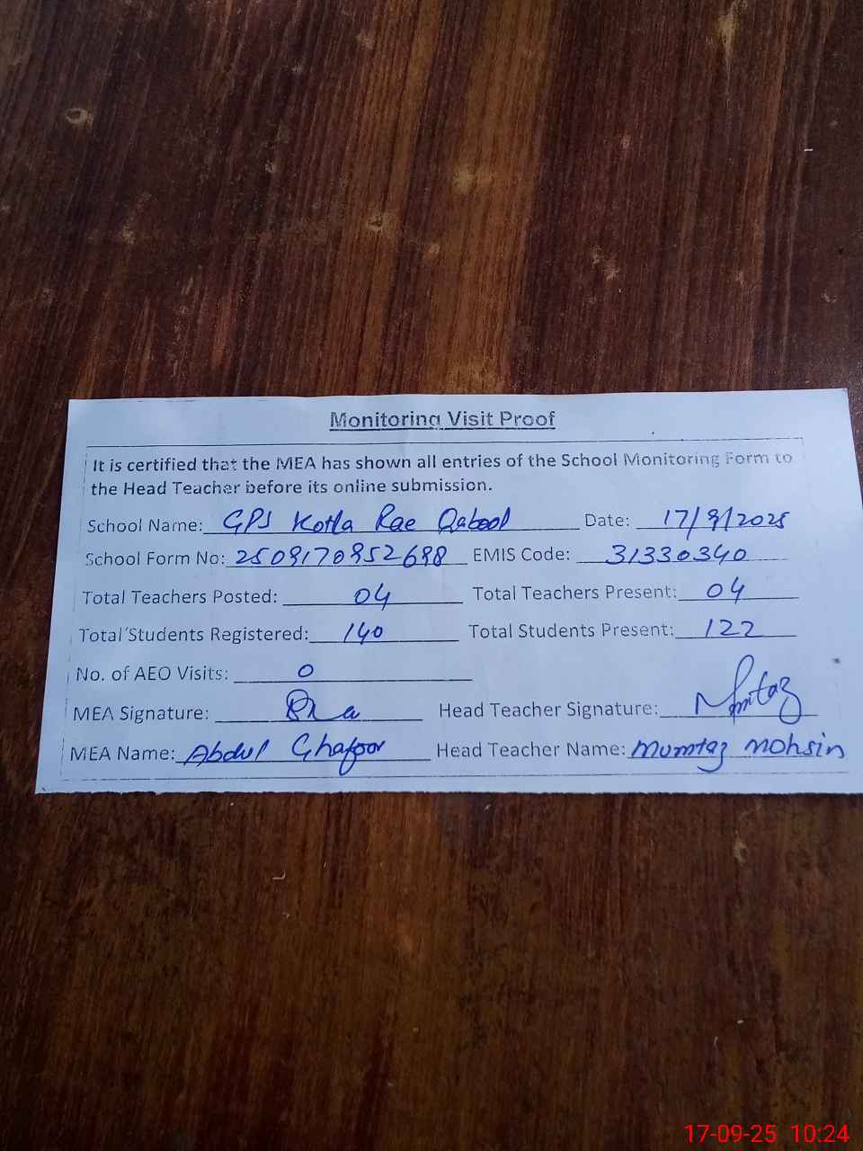 | EMIS Code: 31330340 | Name of School: GPS KOTLA RAIE QABOOL | |||
