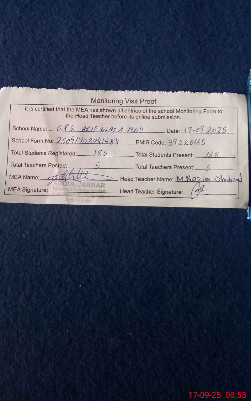 | EMIS Code: 39220165 | Name of School: GPS ARIF WALA NO 4 | |||